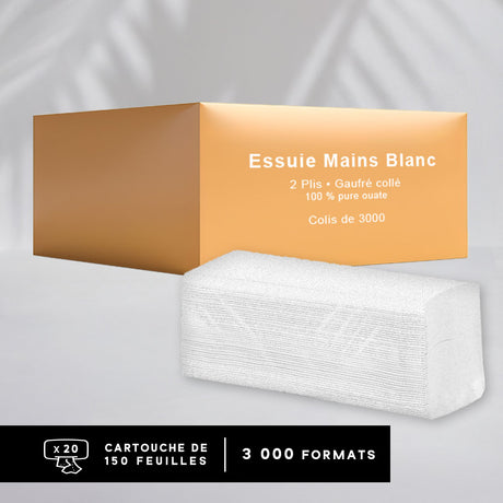 Essuie mains gaufré collé - Pliage en V enchevêtrés - Pure ouate - colis de 3000 formats